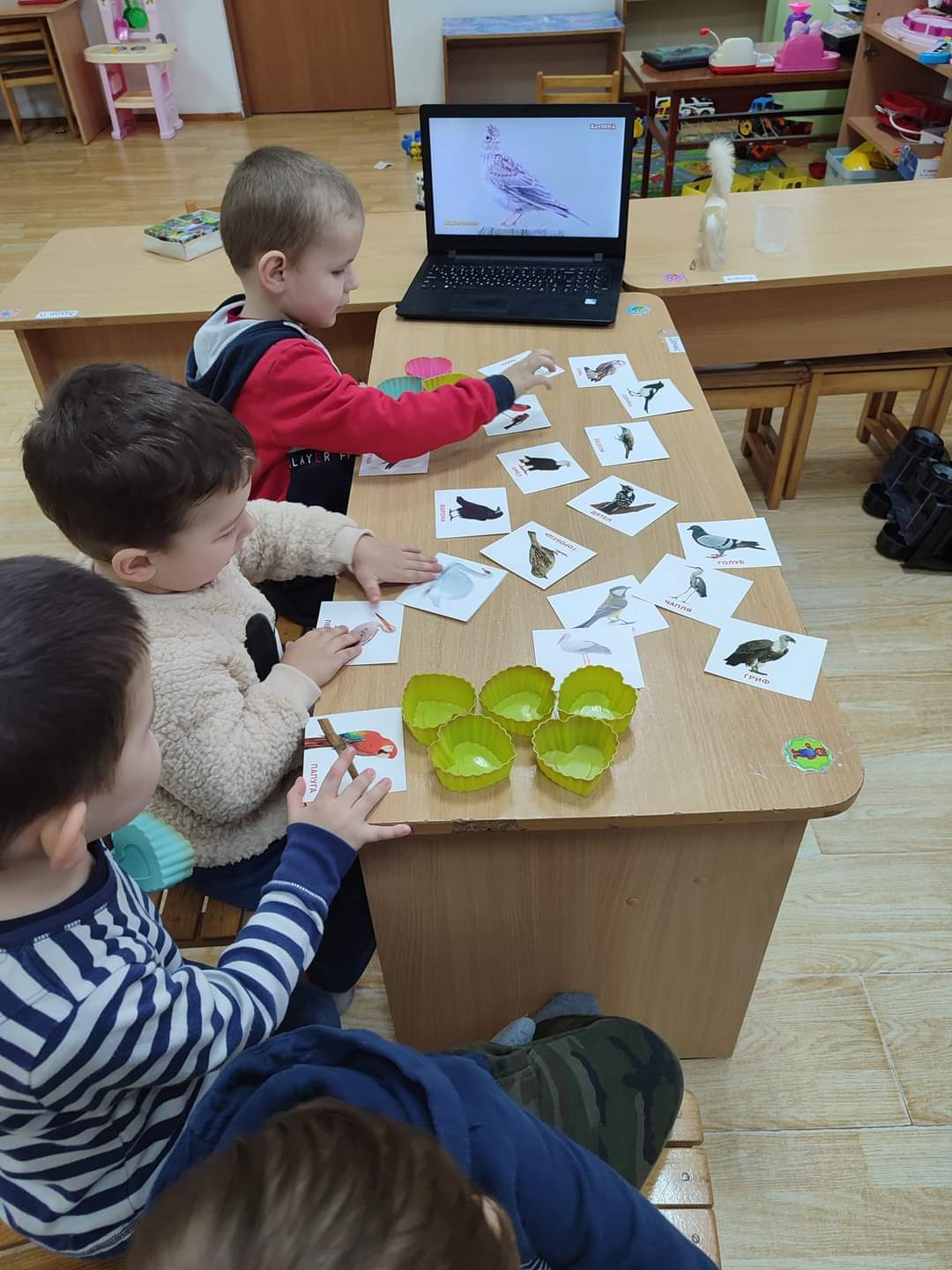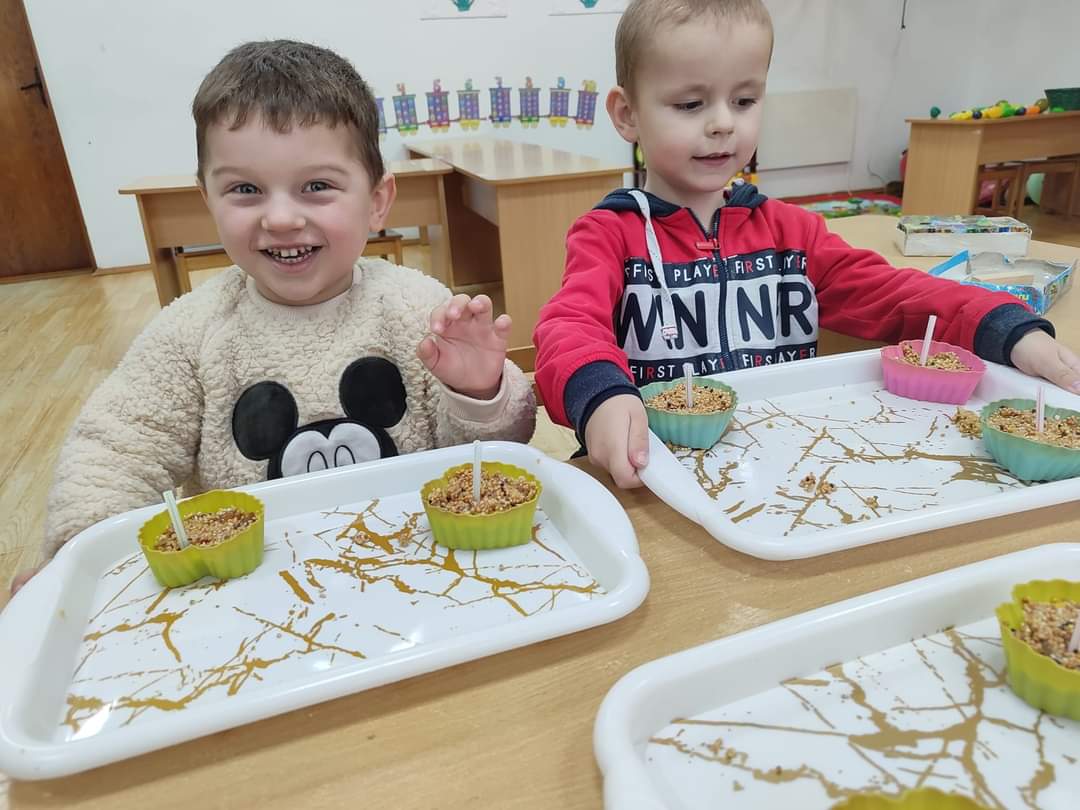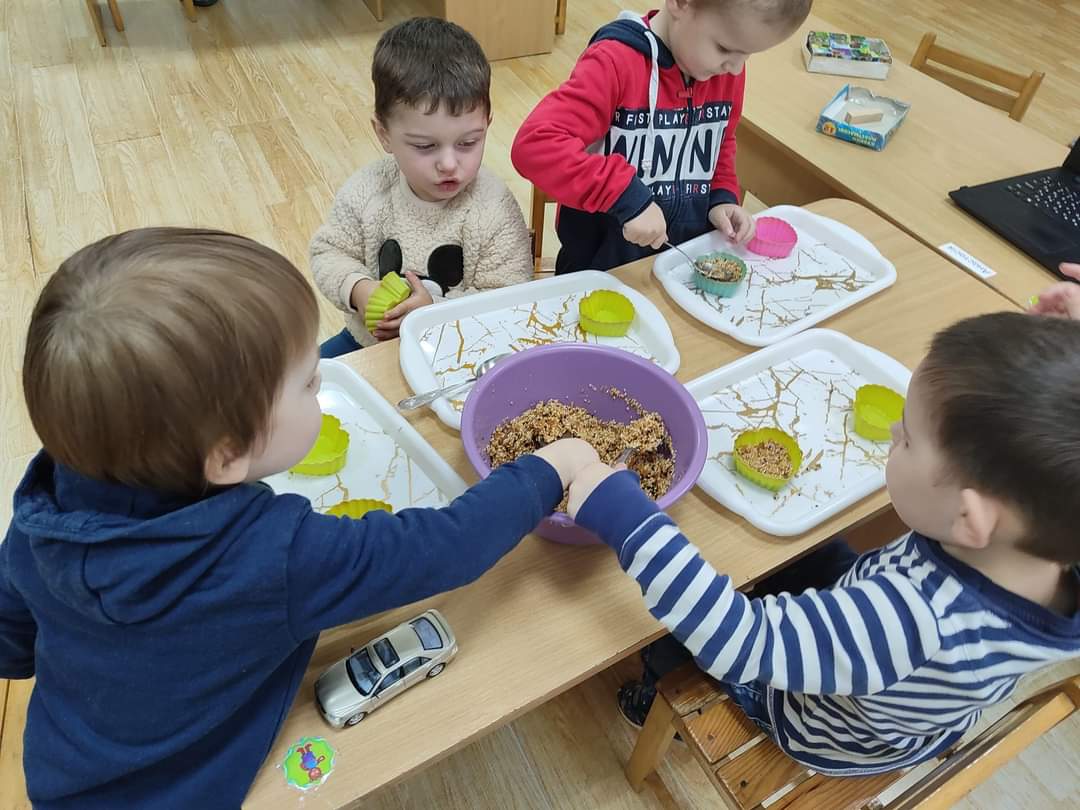 Малята виготовляли еко- годівничку , вивчали види птахів, а також поласували, як пташенята, смачними родзинками.