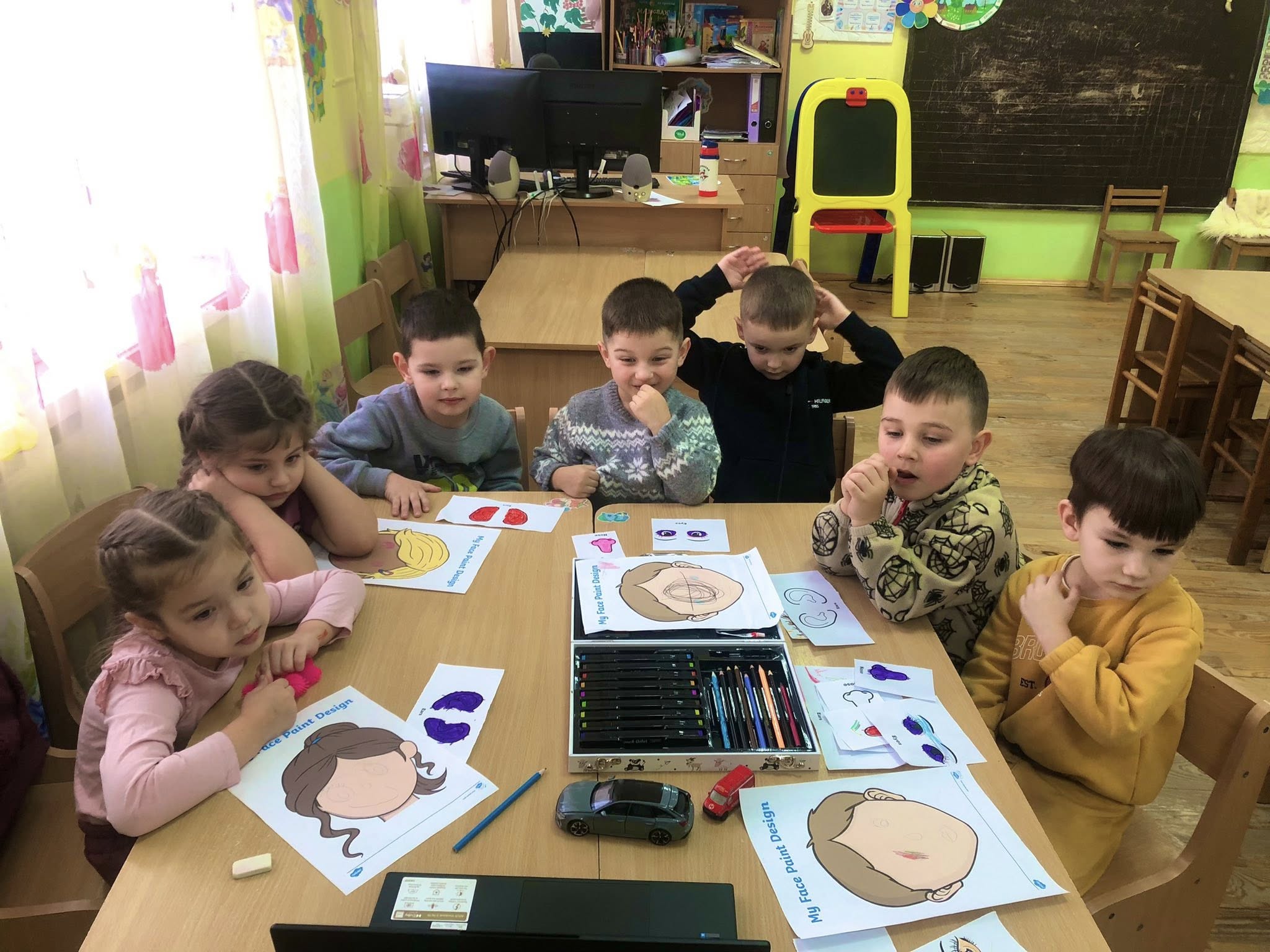 Діти об’єдналися в команди та отримали набір елементів (eyes, nose, mouth, ears, hair). Завдання – правильно розташувати частини обличчя та назвати їх англійською. Було весело, активно й дуже креативно!